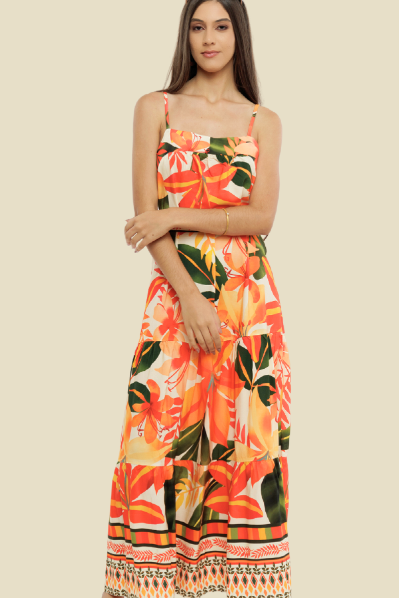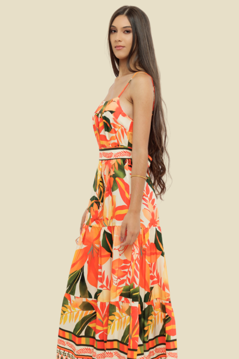 VESTIDO LONGO COM ALÇA/CINTO CRIS FLORAL LARANJA FUNDO BEGE