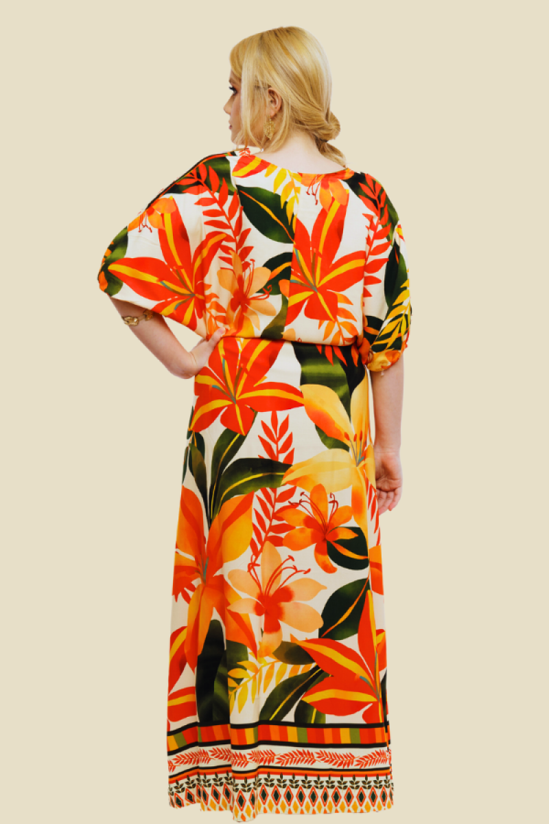VESTIDO LONGO MANGA CURTA CAROL FLORAL LARANJA FUNDO BEGE