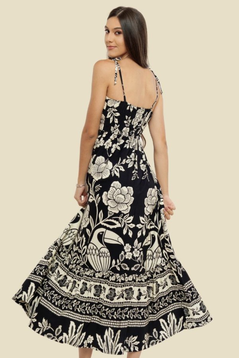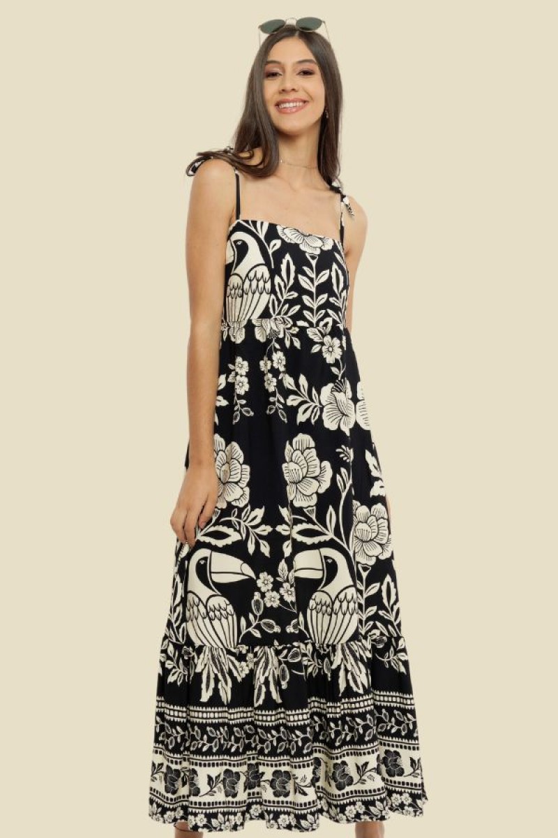 VESTIDO LONGO ALÇA JULIA FLORAL TUCANO PRETO