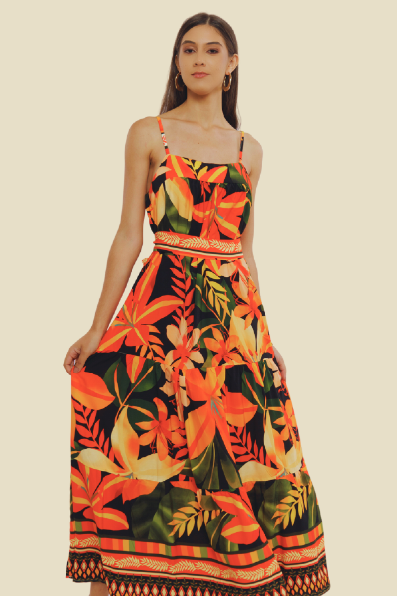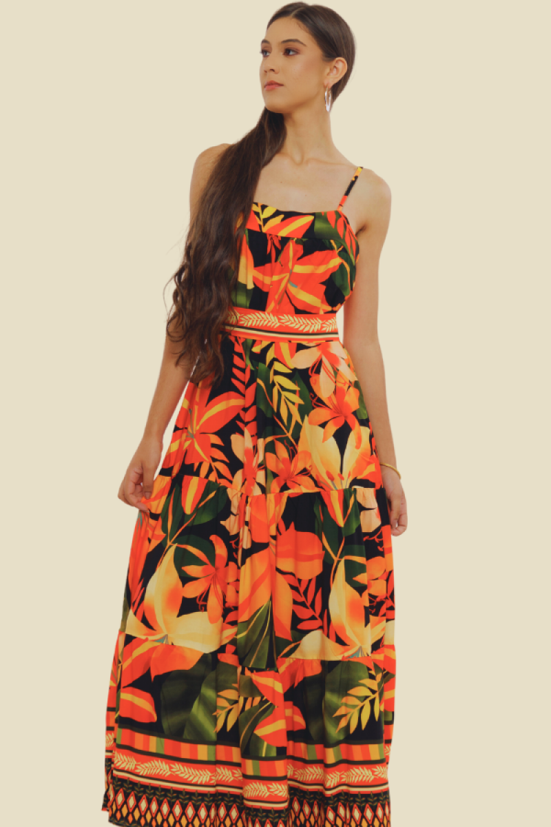 VESTIDO LONGO COM ALÇA/CINTO CRIS FLORAL LARANJA FUNDO PRETO