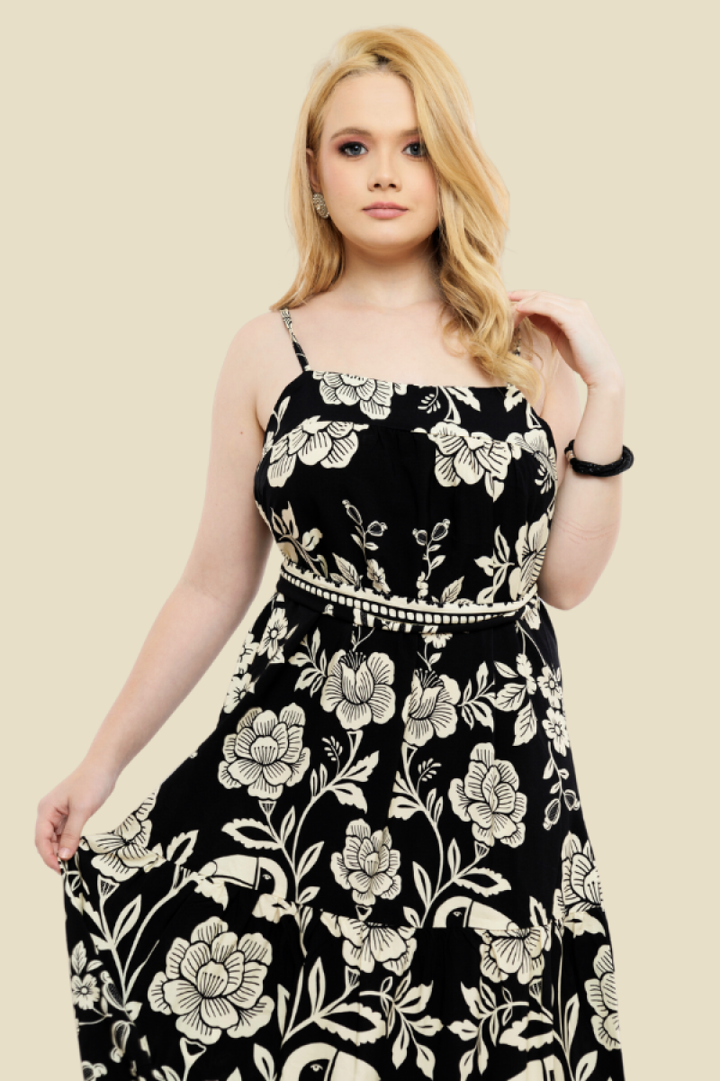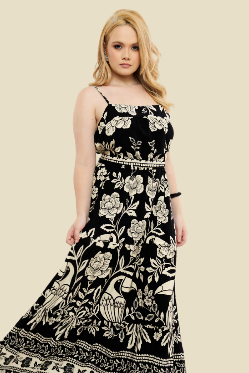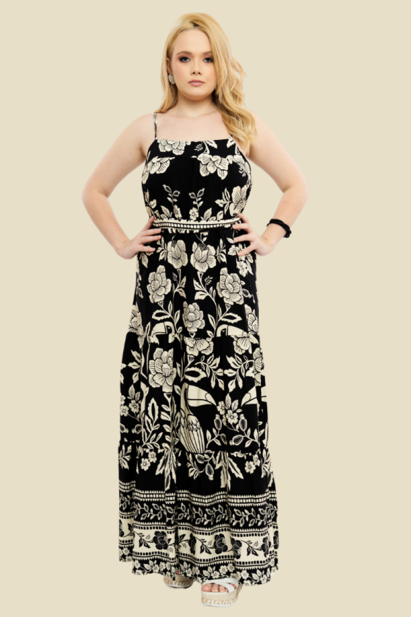 VESTIDO LONGO COM ALÇA/CINTO CRIS FLORAL TUCANO PRETO
