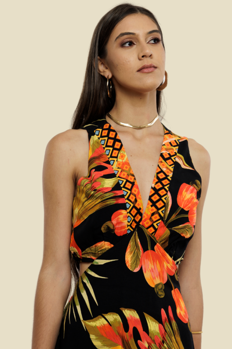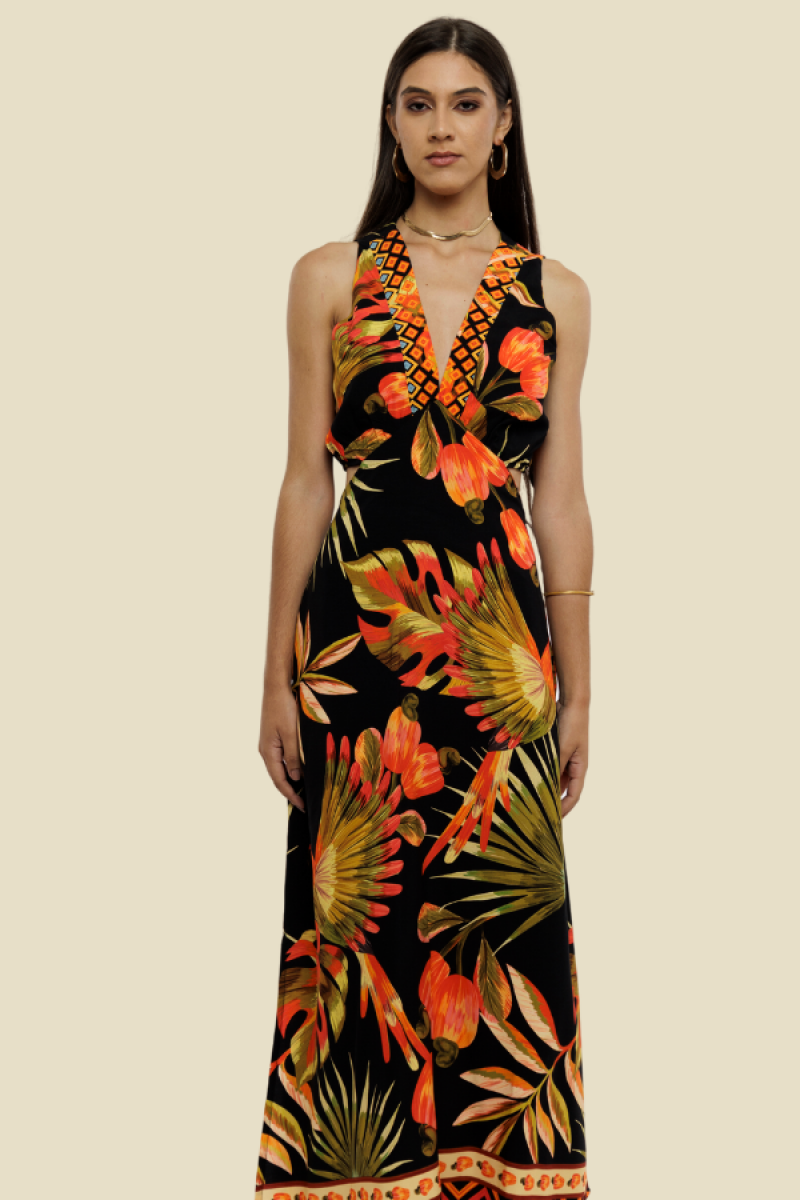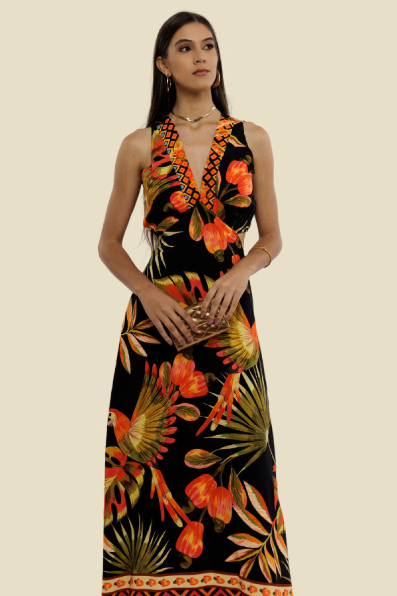 VESTIDO LONGO REGATA FENDA MONY ARARA CAJU FUNDO PRETO